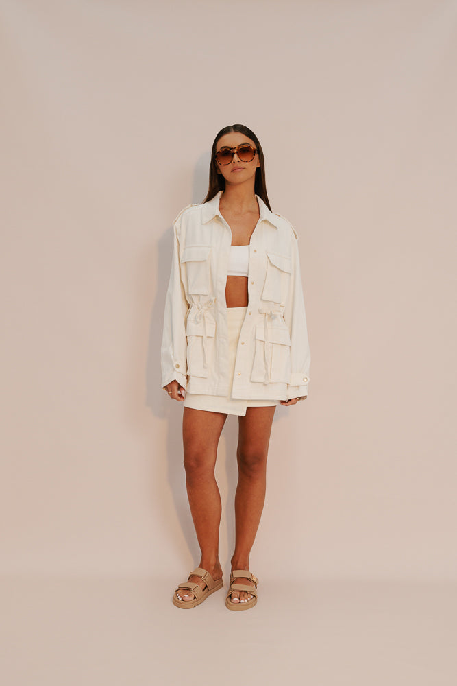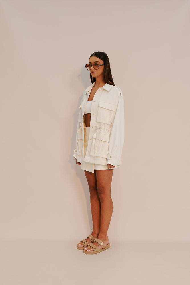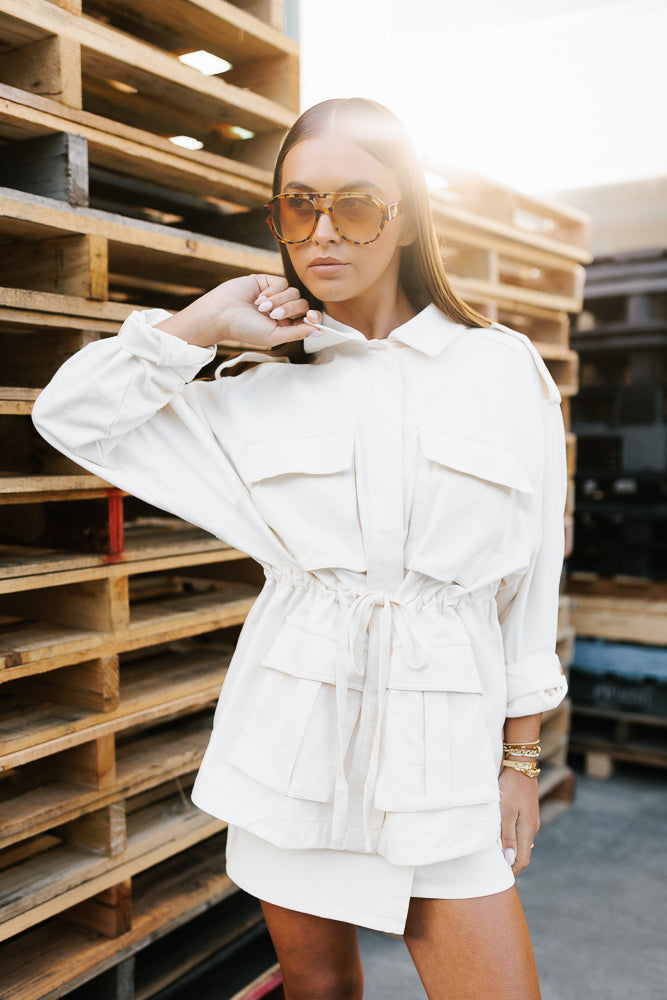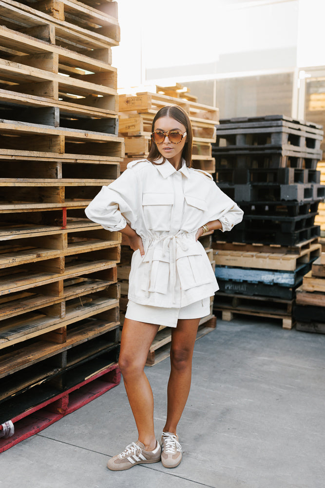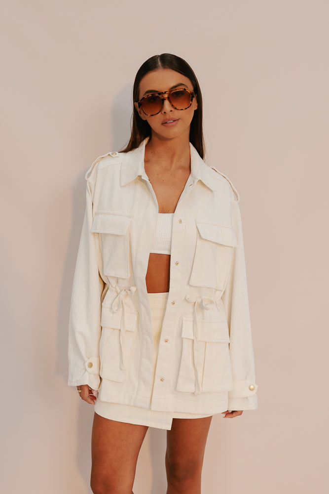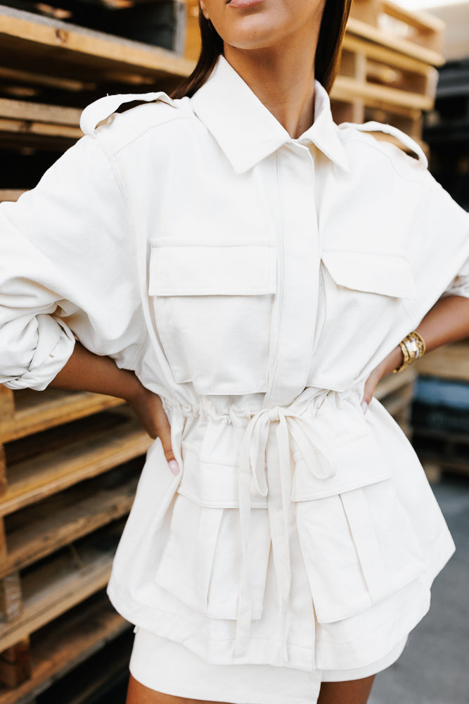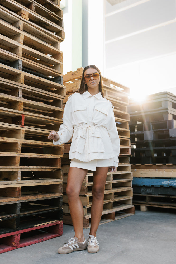 The Gemini Jacket is a cream utility jacket that effortlessly blends style and function. The oversize, relaxed silhouette with an elasticated waistband and drawstring for a customizable fit. Featuring four large pockets to front, adjustable cuffs and shoulder details with rose gold buttoned straps that all add a touch of refined detail. Perfect for layering, the Gemini Jacket combines versatility with a contemporary edge.