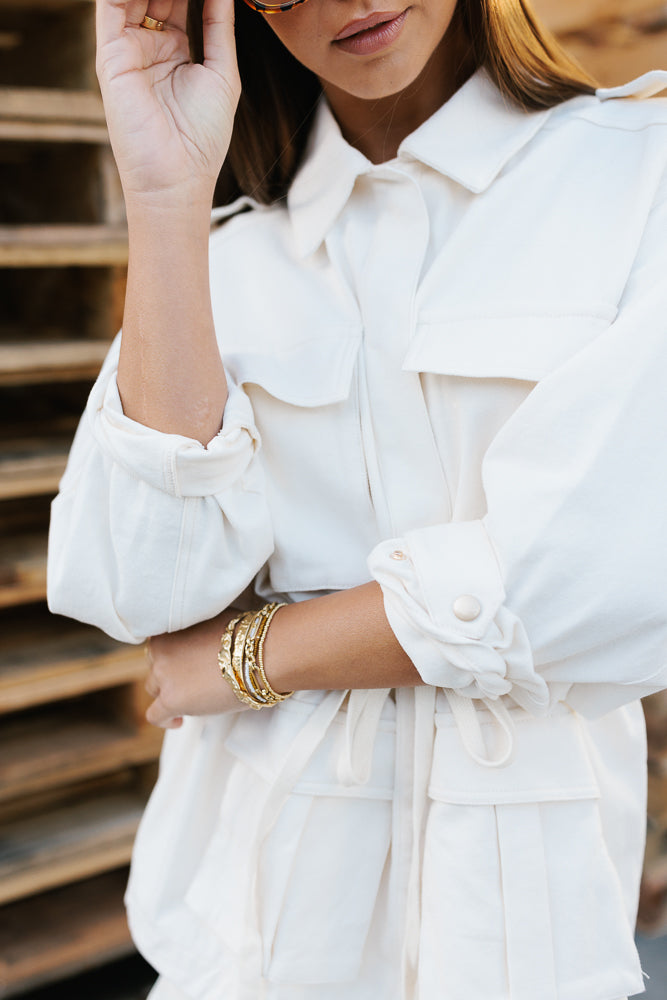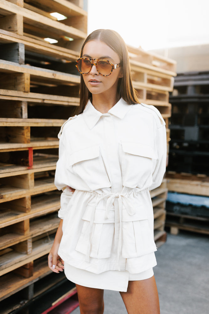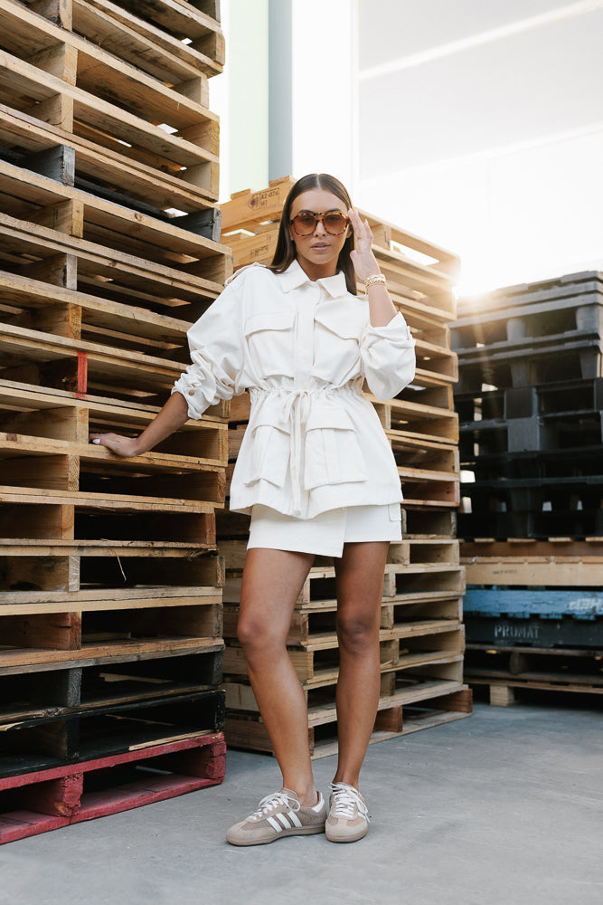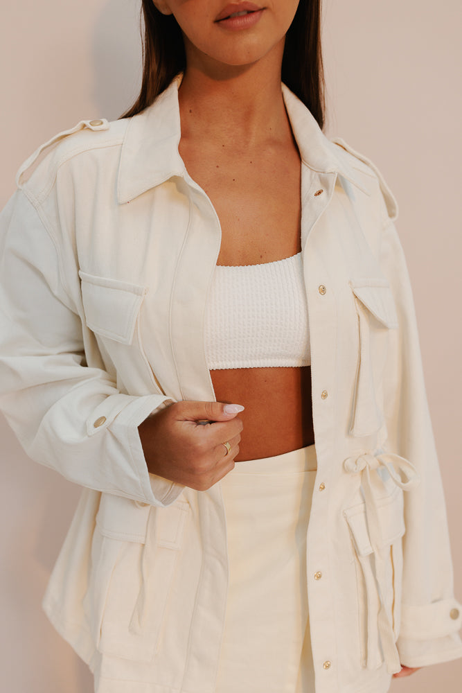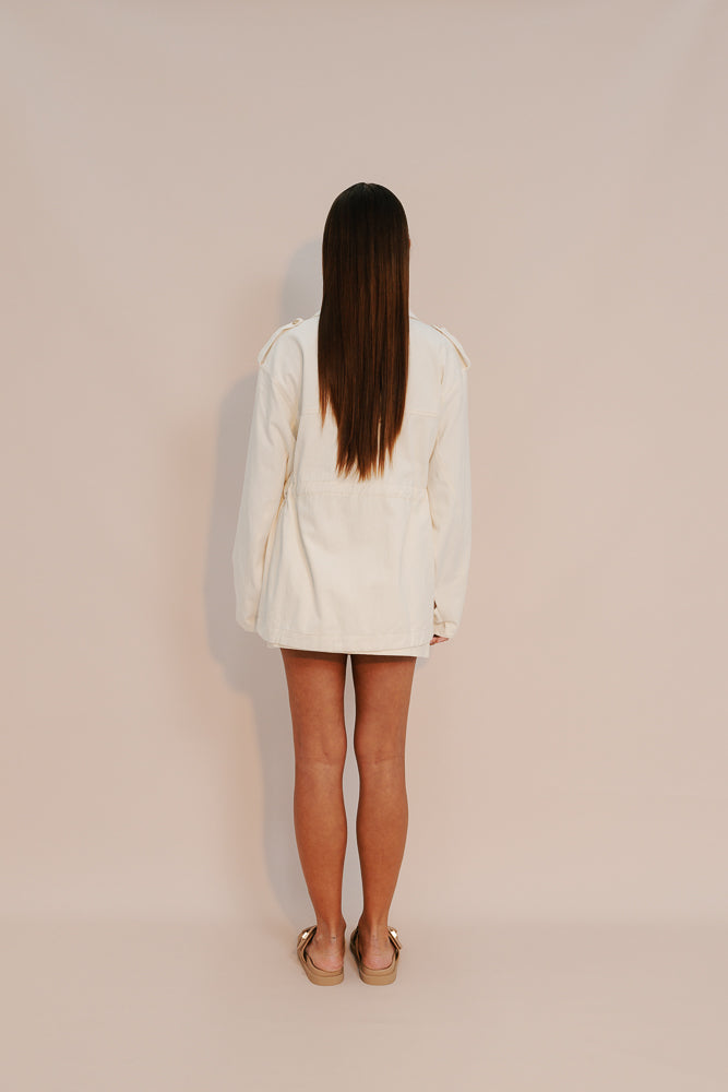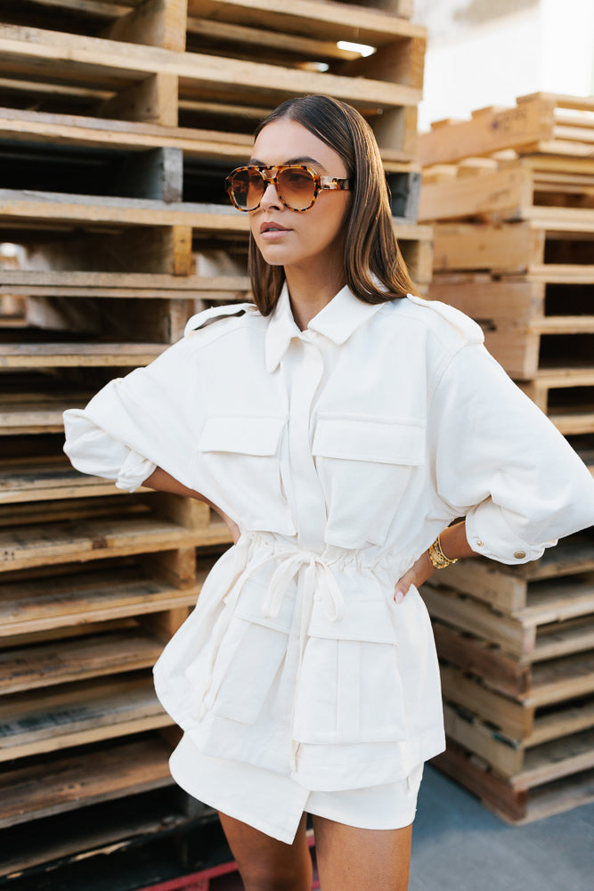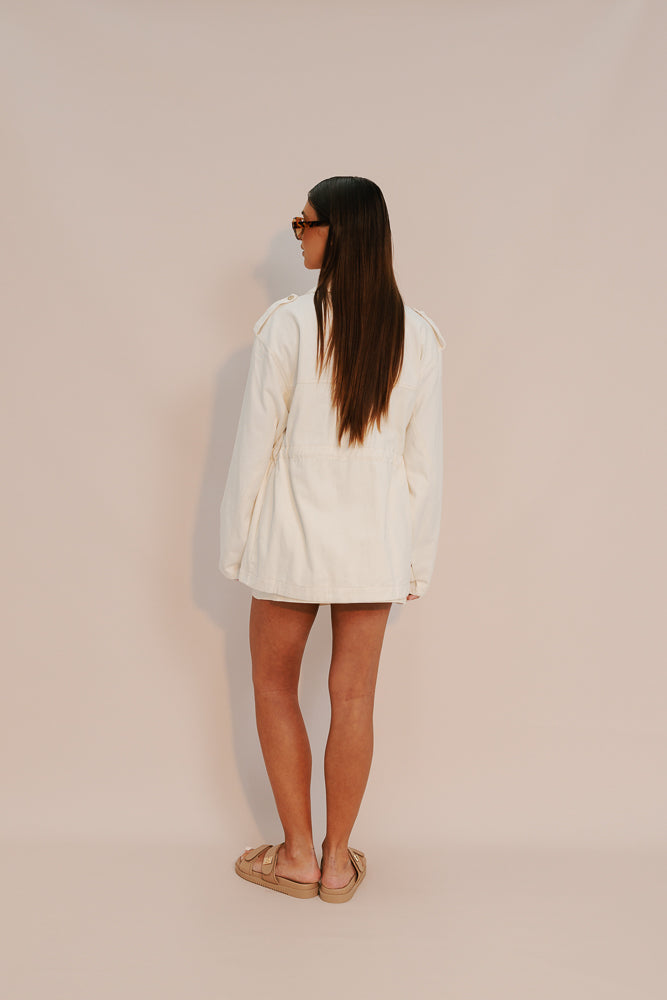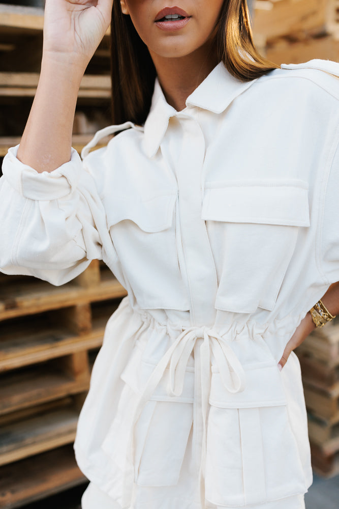 The Gemini Jacket is a cream utility jacket that effortlessly blends style and function. The oversize, relaxed silhouette with an elasticated waistband and drawstring for a customizable fit. Featuring four large pockets to front, adjustable cuffs and shoulder details with rose gold buttoned straps that all add a touch of refined detail. Perfect for layering, the Gemini Jacket combines versatility with a contemporary edge.
