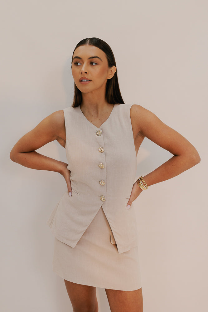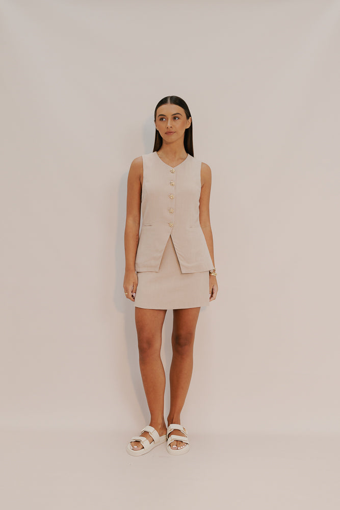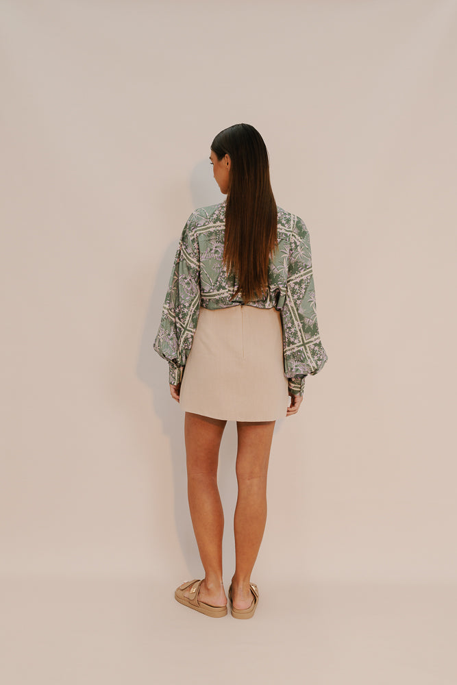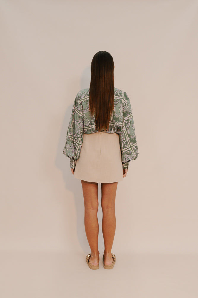 The Lark Mini Skirt in Sand offers a classic and effortlessly chic addition to your wardrobe. This soft, sand-hued linen blend mini skirt features a flattering a-line silhouette and mid-waist fit for a refined shape. The faux front pockets add a subtle touch of detail to a classic mini, with hidden zip entry to back ensuring a sleek finish to this versatile piece.