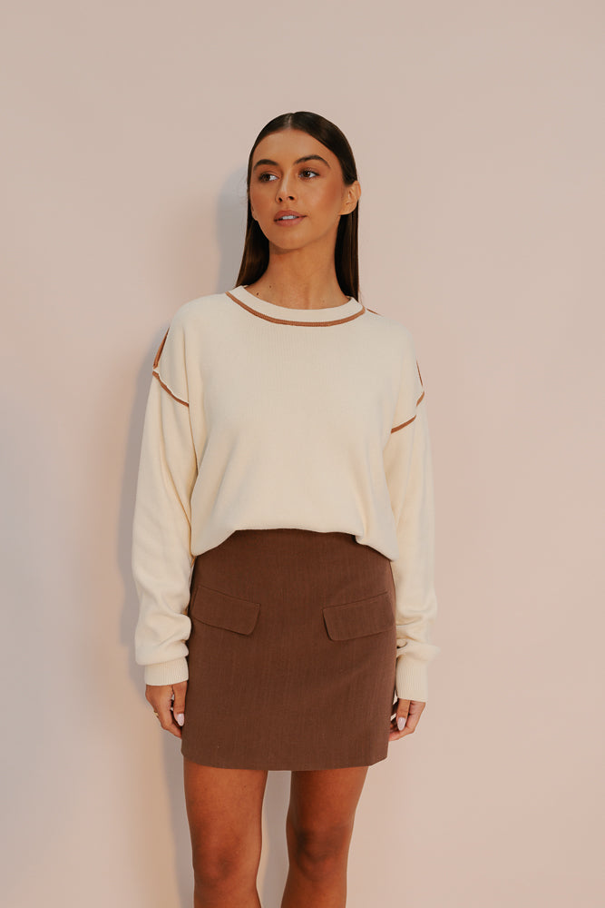 The Libra Knit Jumper is a beautifully crafted knitwear piece, in a finely ribbed cream knit with chic chocolate trim detail. The drop shoulder design and scooped neckline offers a relaxed, yet stylish look. Featuring cuffed sleeves and waistband for a snug fit, and made from a super soft fabrication, for ultimate comfort. The Libra Knit Jumper is perfect for layering with elegance.