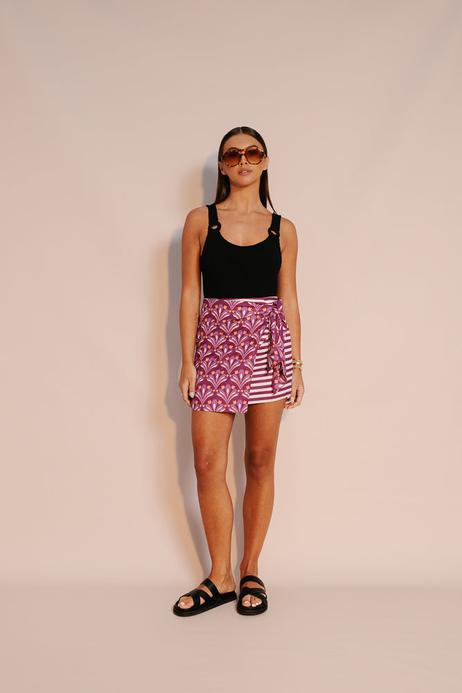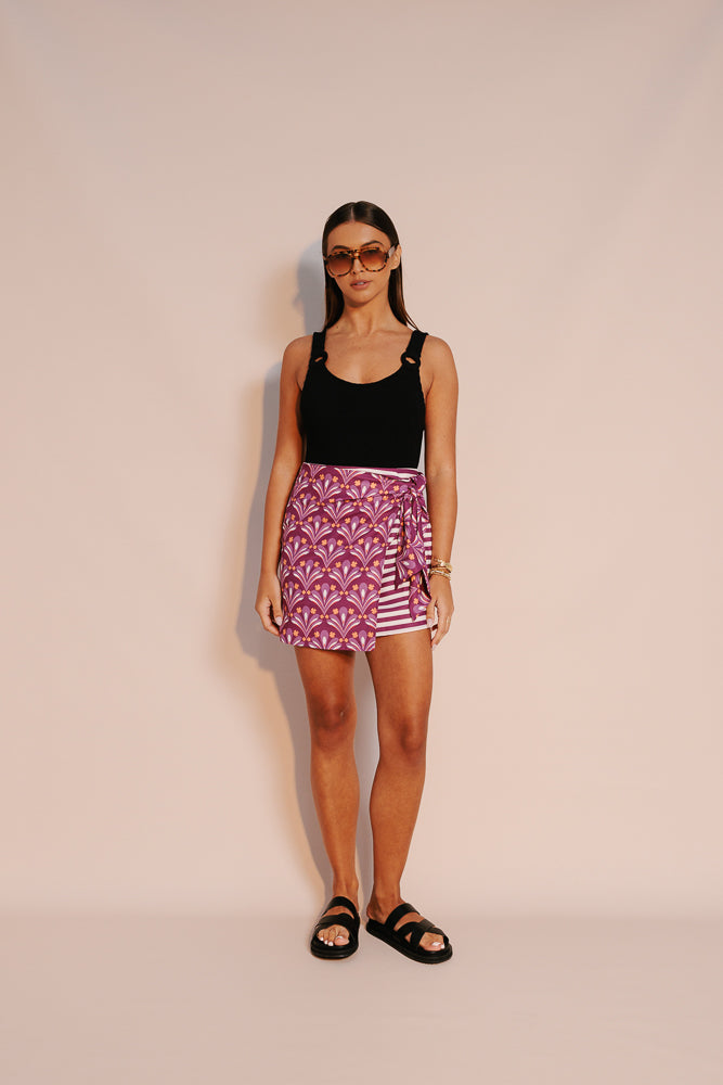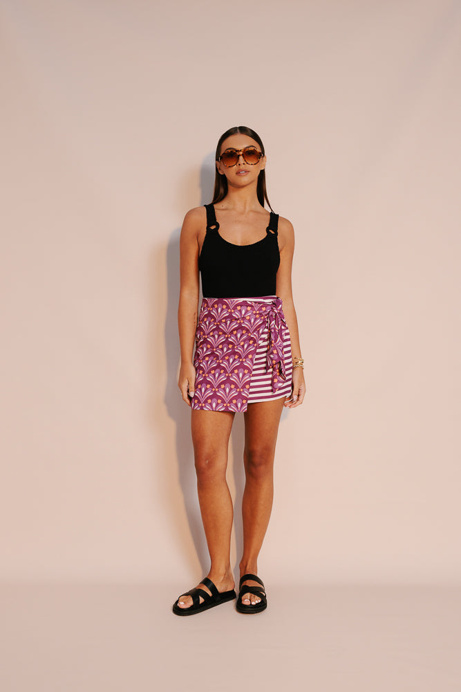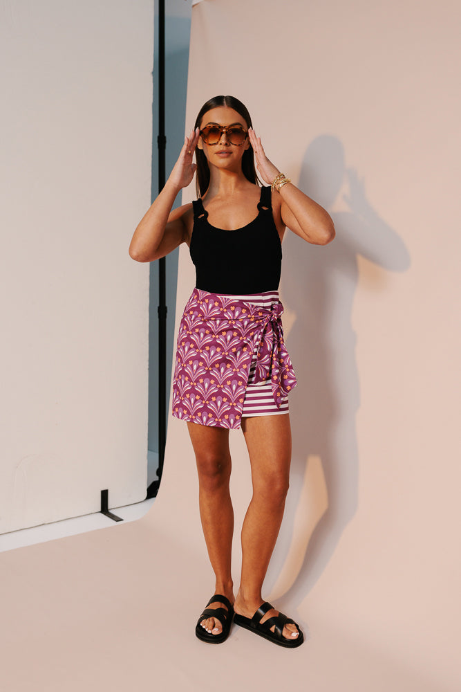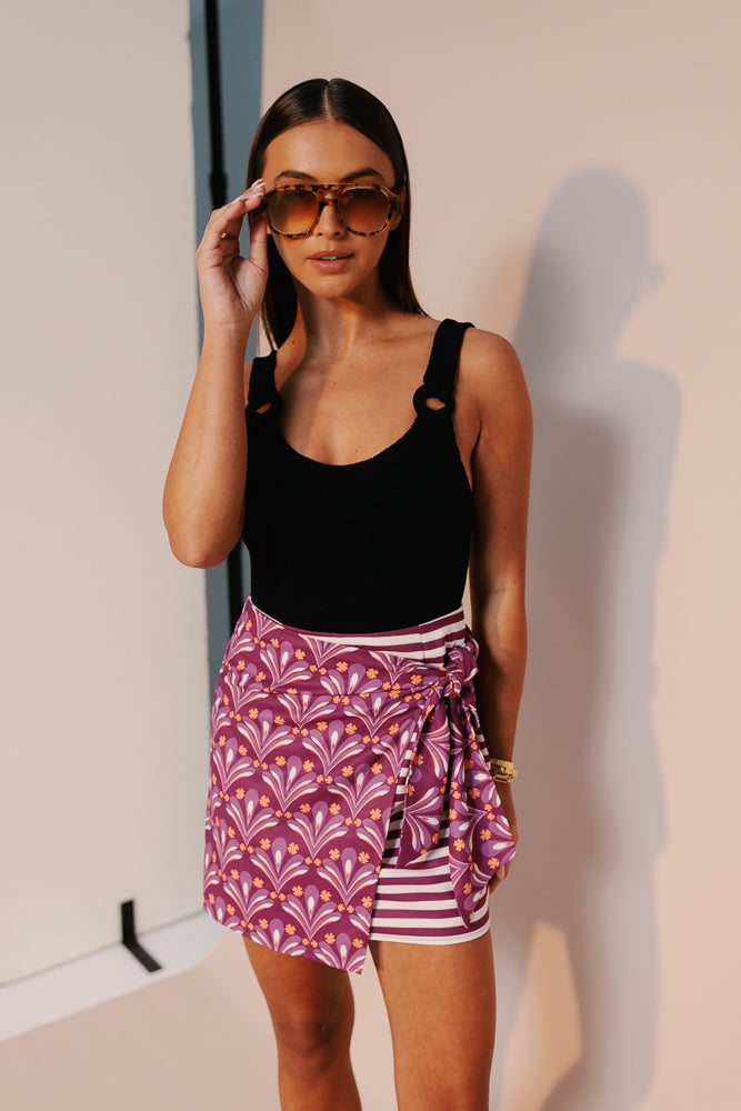 The Monet Skirt combines striking style with effortless wearability. Showcased in a bold colour palette, our Zella exclusive Bloom print pairs with contrasting stripes and adjustable knot detail offers an eye-catching asymmetrical design. The Monet Skirt is a sweet and stylish statement piece.