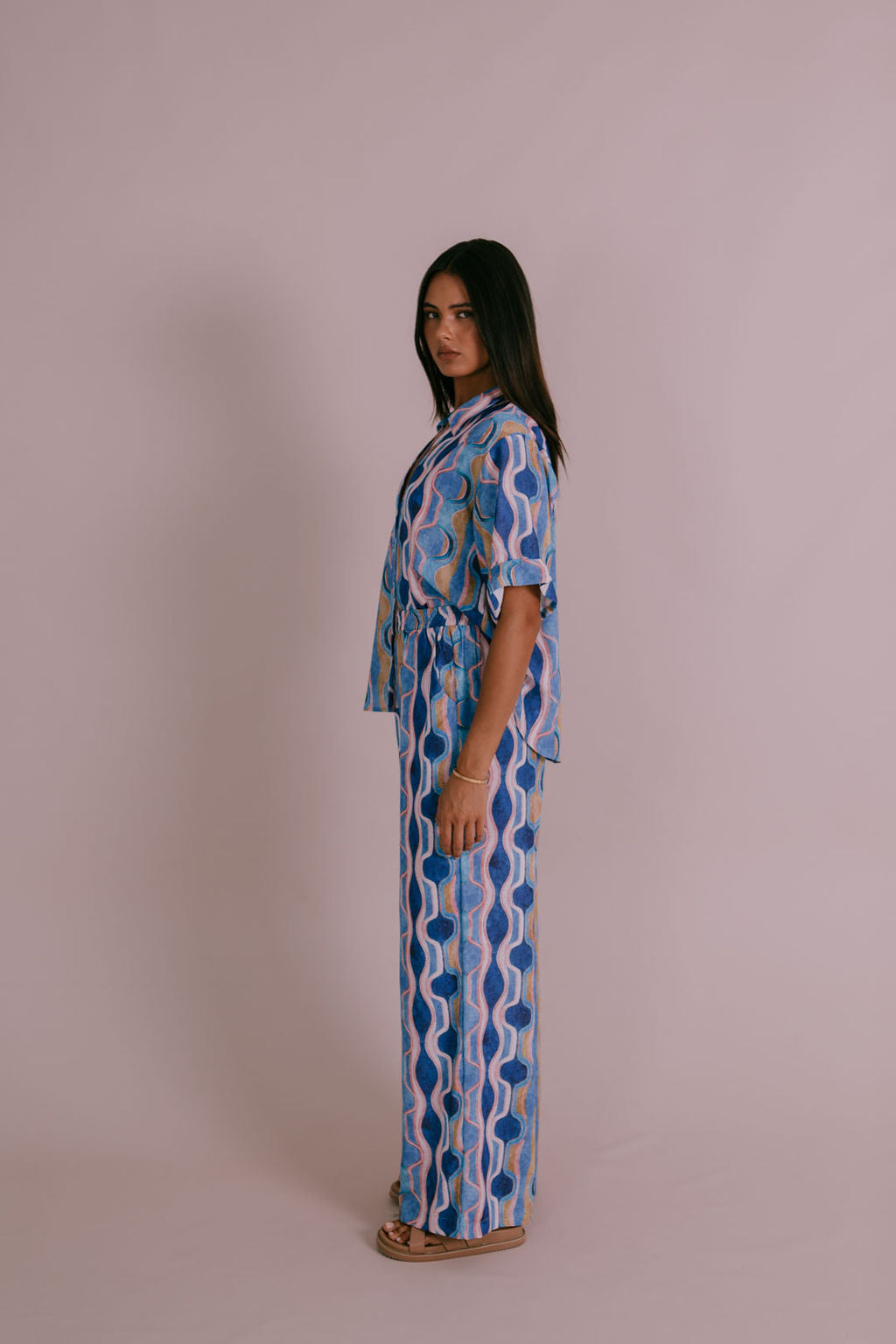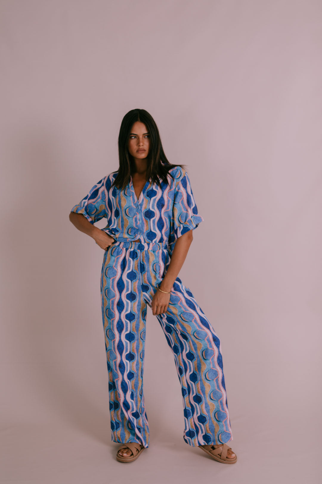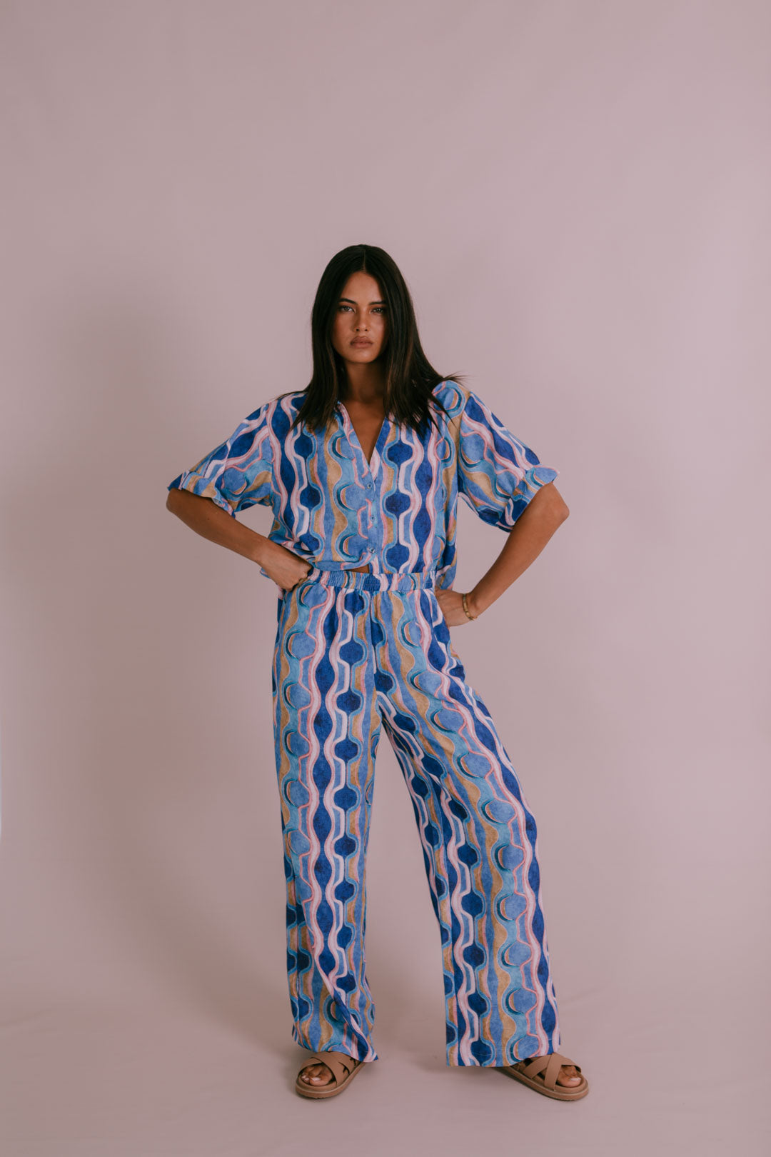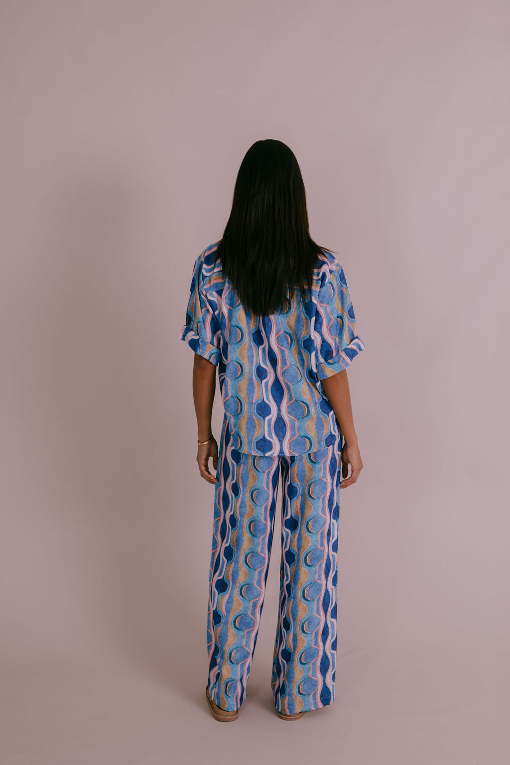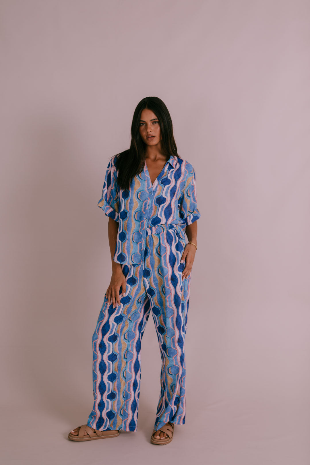 The Santorini Pants in Greece Print make a striking addition to any wardrobe. Featuring a Zella exclusive watercolor design in shades of blues, baby pink, and tan, they offer a perfect balance of style and comfort. The high-waisted, wide-leg silhouette is enhanced by a stretch elastic waistband, ensuring an effortless and flattering fit.