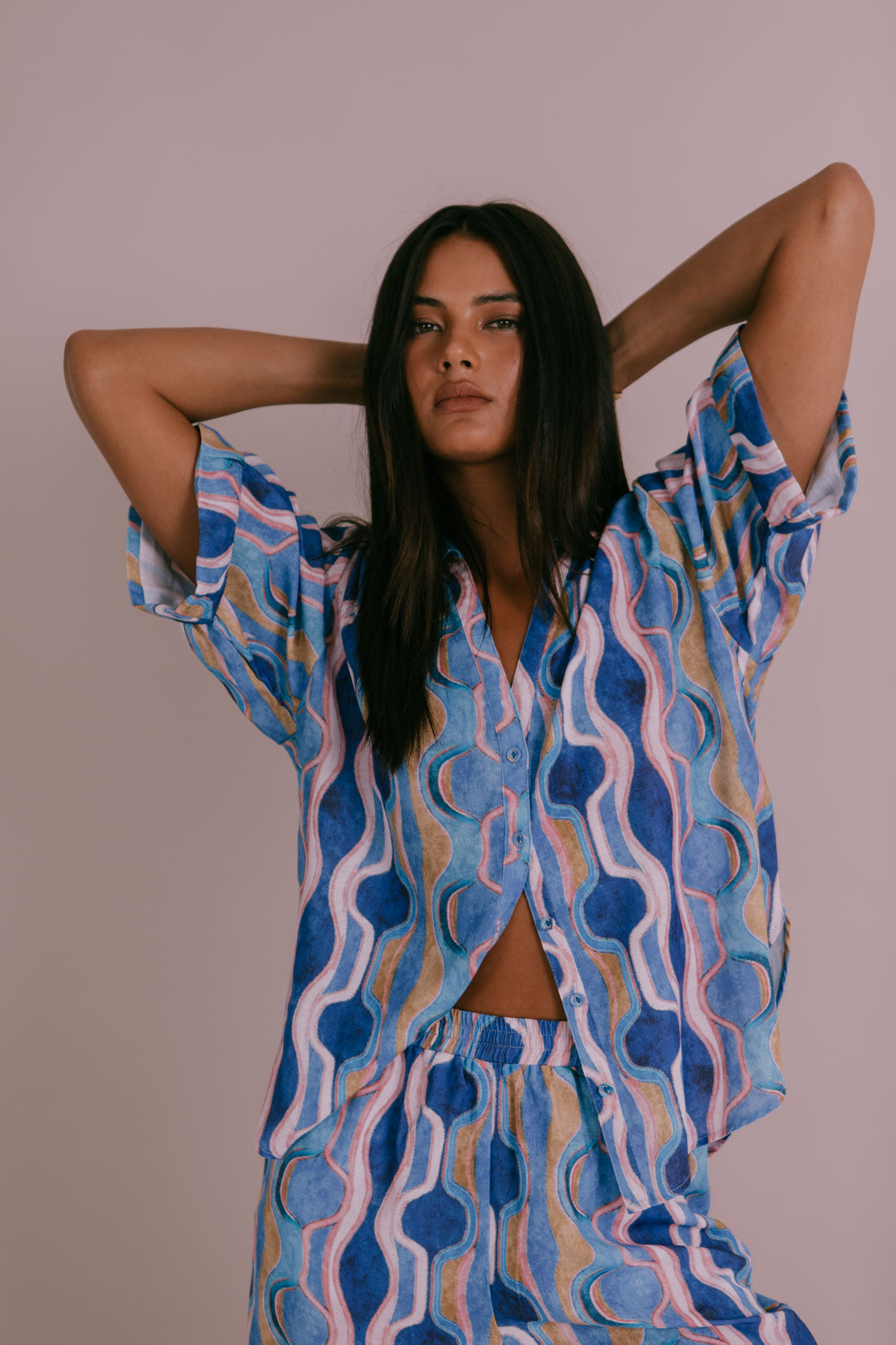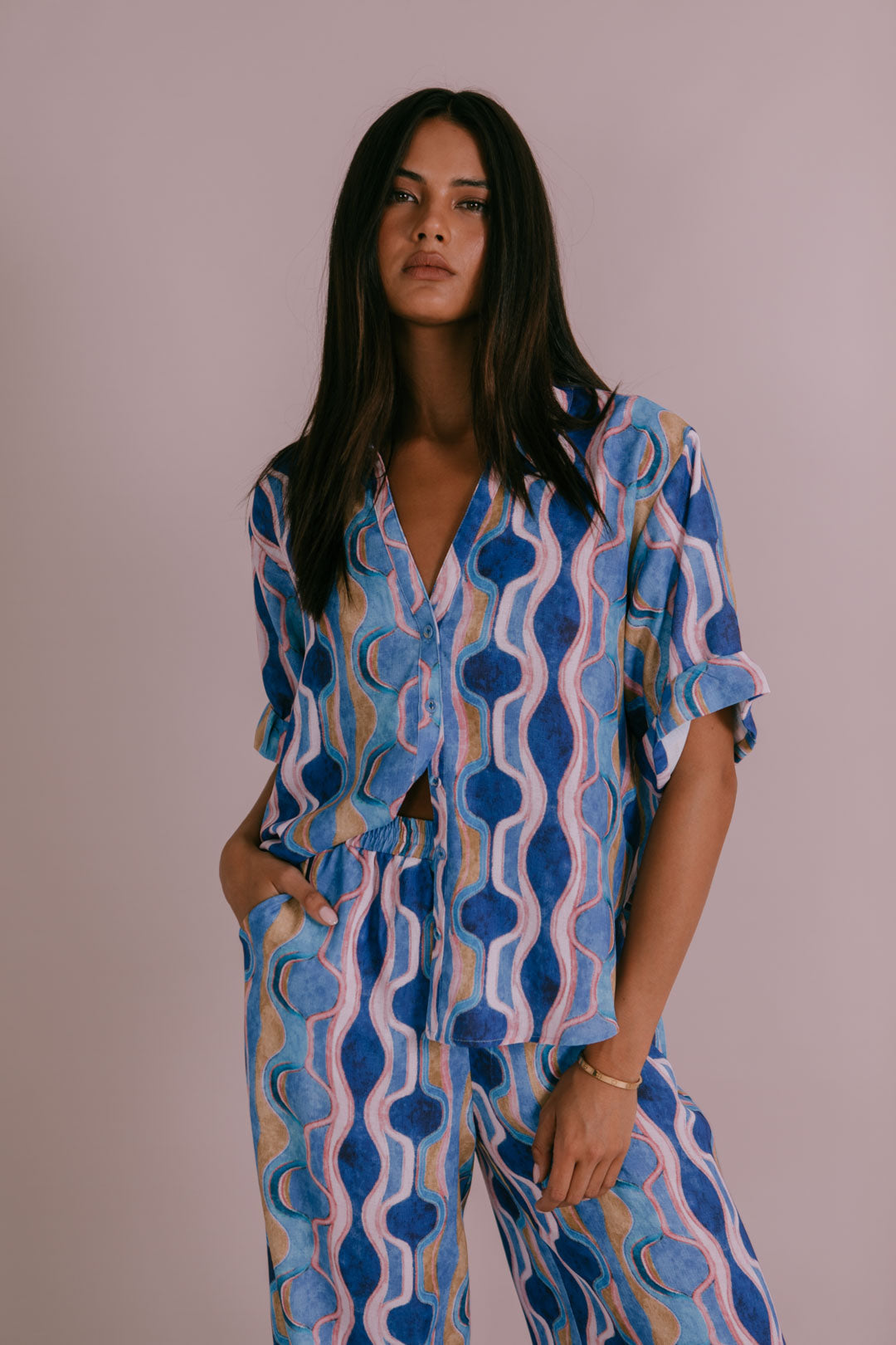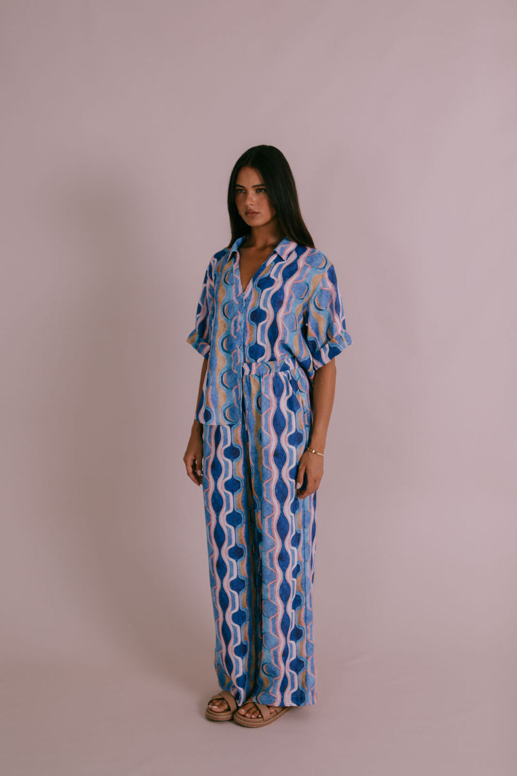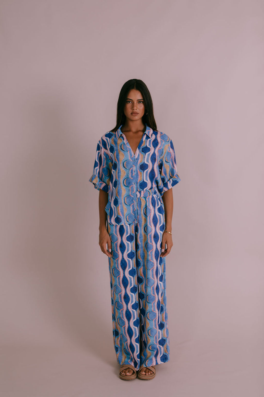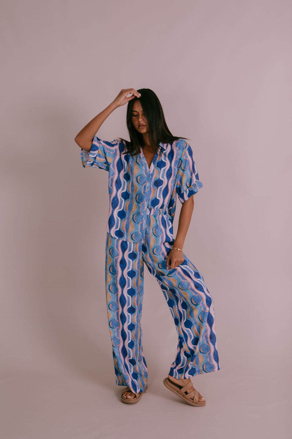 The Santorini Pants in Greece Print make a striking addition to any wardrobe. Featuring a Zella exclusive watercolor design in shades of blues, baby pink, and tan, they offer a perfect balance of style and comfort. The high-waisted, wide-leg silhouette is enhanced by a stretch elastic waistband, ensuring an effortless and flattering fit.